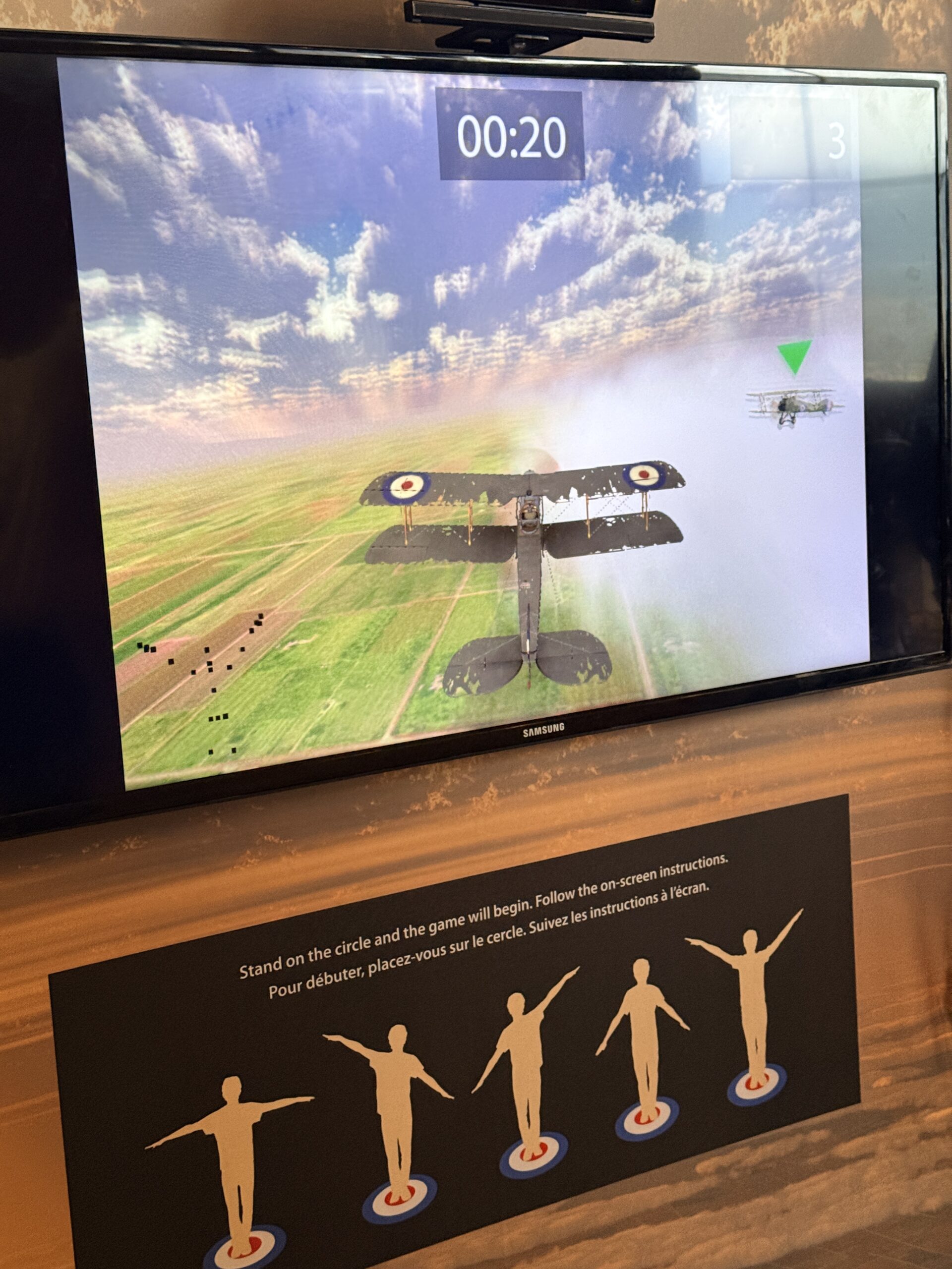 This immersive installation transforms flight into a full-body experience. Instead of using a joystick or traditional flight controls, visitors pilot a historic Sopwith Camel biplane using movement. By raising or lowering their arms and tilting their body, participants steer their aircraft through a First World War aerial mission — dodging enemy planes and lining up their target in the skies.